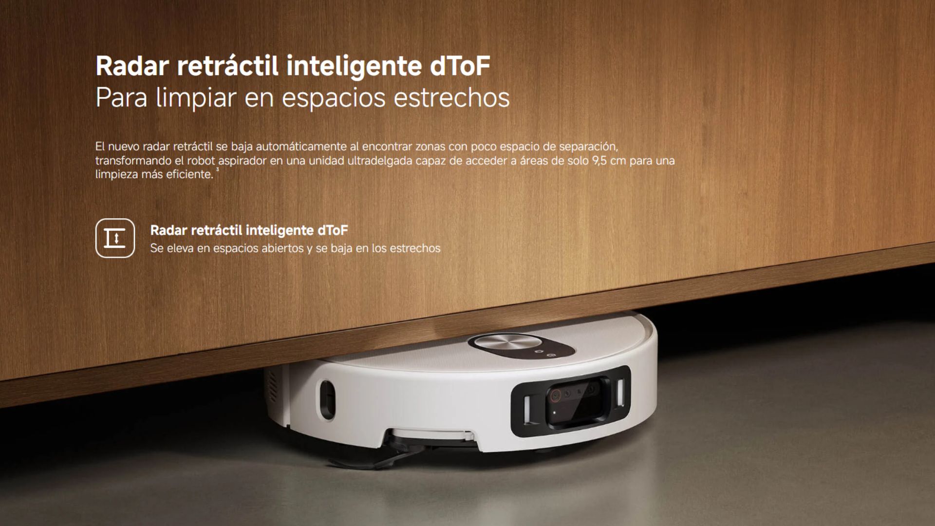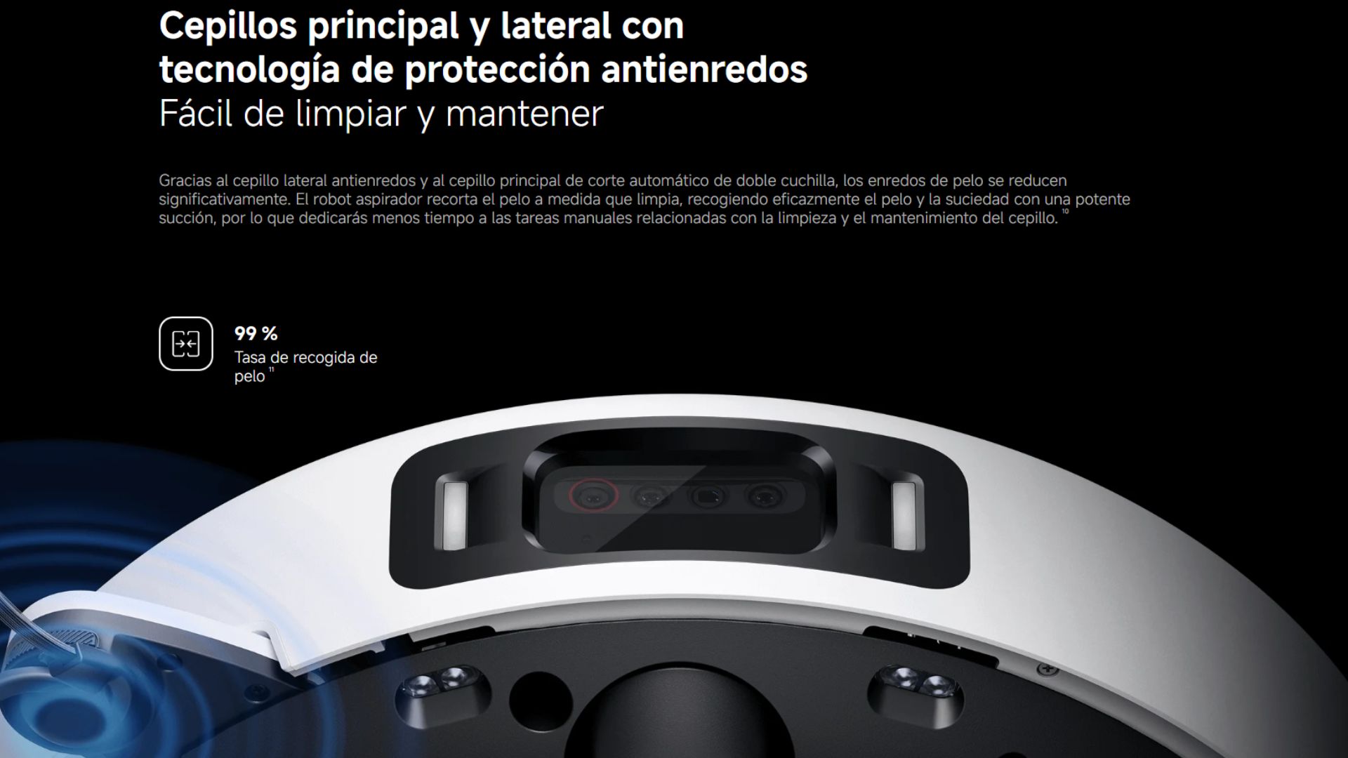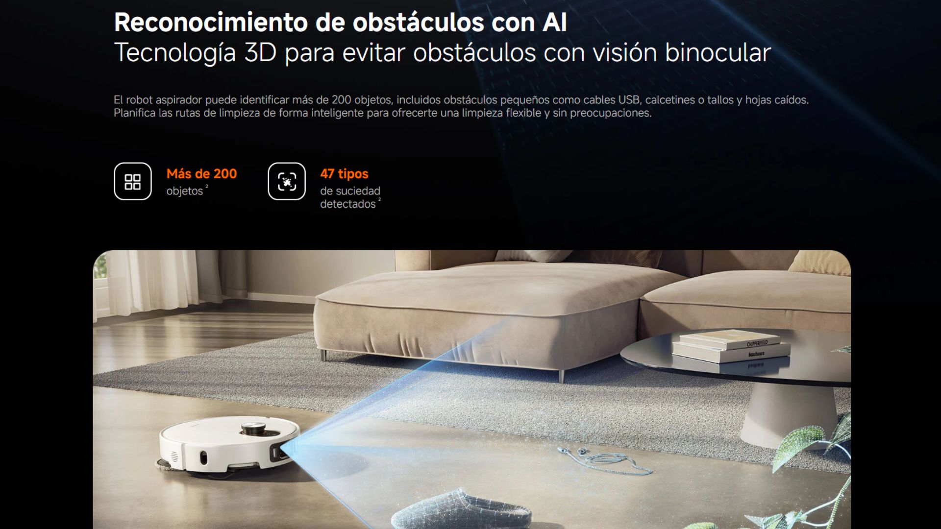 Con una cámara RGB, dos cámaras infrarrojas y un proyector infrarrojo 3D de puntos, el robot aspirador detecta la suciedad y percibe el entorno en tiempo real, lo que le permite limpiar de manera flexible e inteligente, sin movimientos aleatorios.