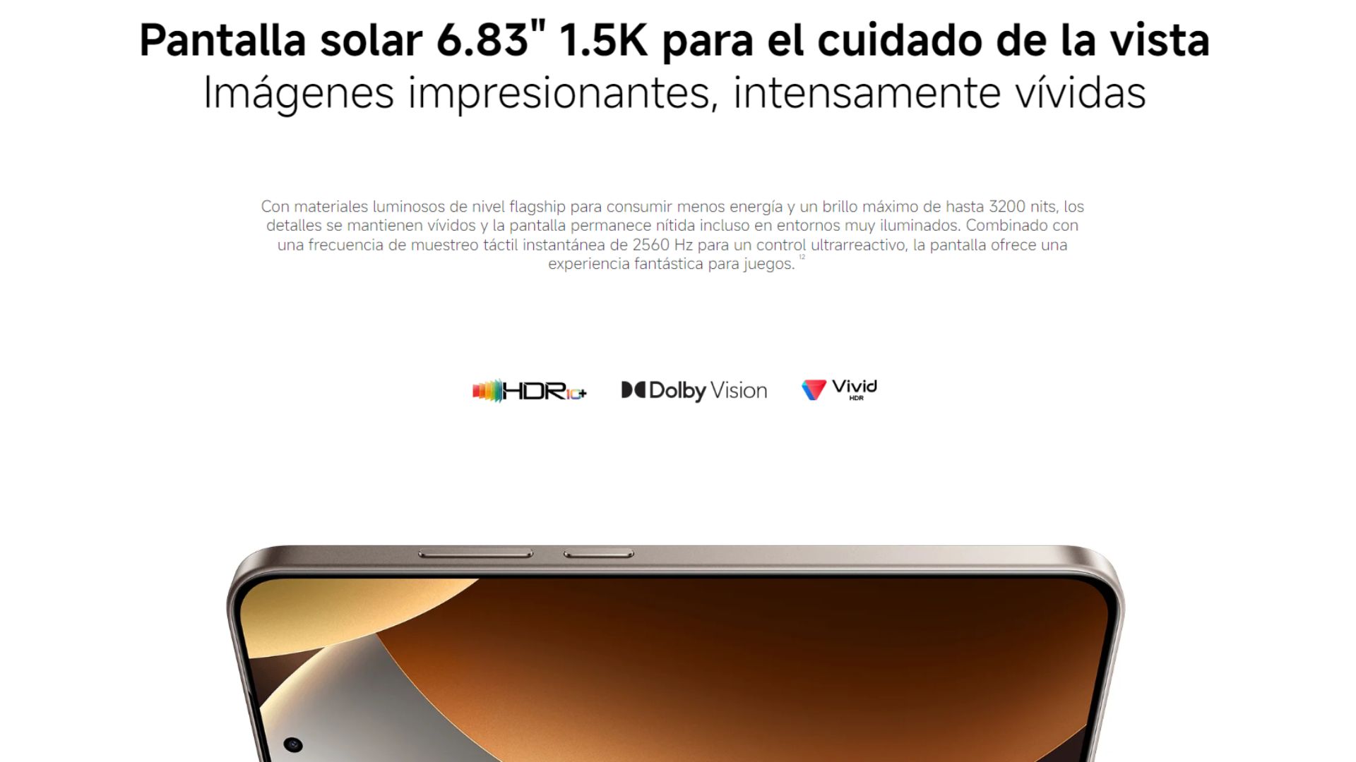 | Pantalla | AMOLED de 6,83" | Resolución: 1.5K (2772 x 1280) | Frecuencia de actualización: Hasta 120 Hz | Frecuencia de muestreo táctil: Hasta 480 Hz | Frecuencia de muestreo táctil instantánea: 2560 Hz | *Activado en Game Turbo | Brillo: 3200 nits de brillo máximo | Brillo: HBM 1800 nits | Profundidad de color: 12 bits | Relación de contraste: 8000000:1 | Amplia gama de colores DCI-P3 | 447 ppp | Corning® Gorilla® Glass Victus® 2 | Pantalla bajo la luz del sol | HDR10+ | Dolby Vision® | Ajuste automático de brillo en 16000 pasos | Atenuación PWM de 3840 Hz|Certificación TÜV Rheinland Low Blue Light (Hardware Solution) | Certificación TÜV Rheinland Circadian Friendly | Certificación TÜV Rheinland Flicker Free |