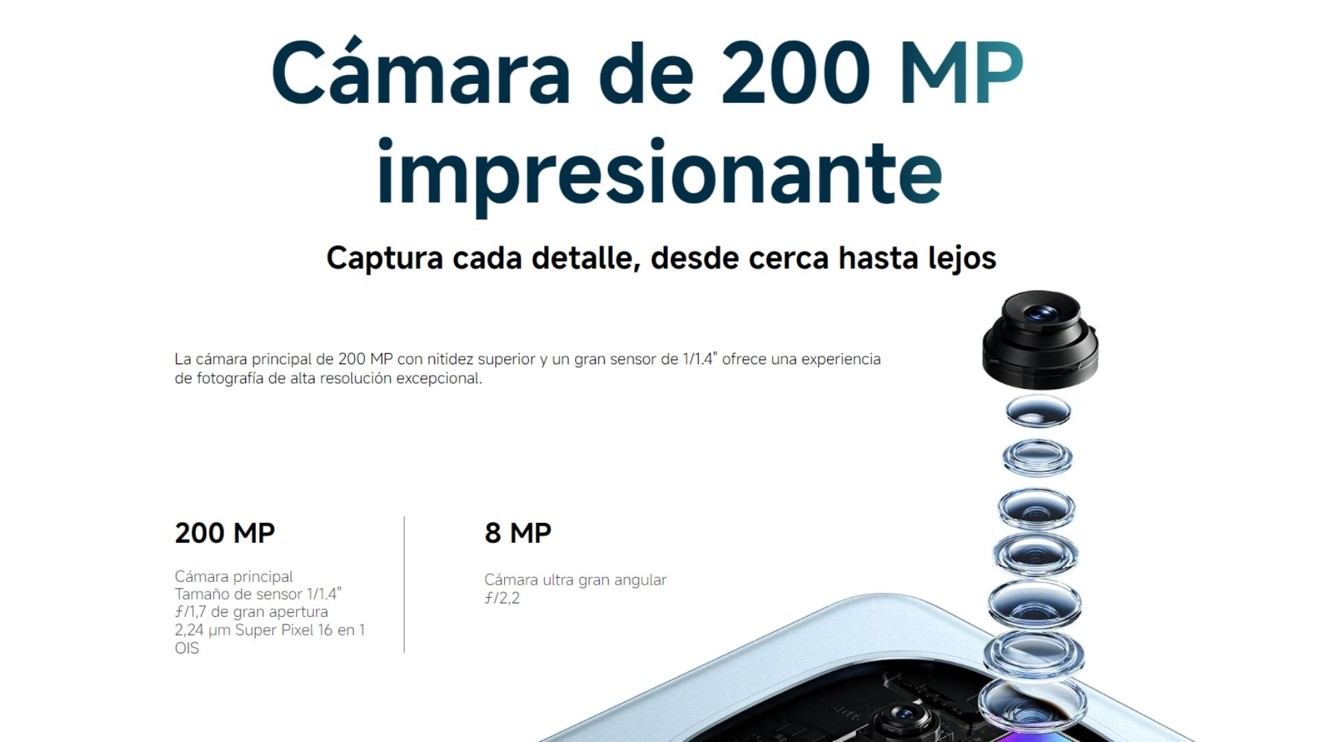 Cámara Trasera 200 MP + 8 MP | OIS | f/1,7 + f/2,2 | Fusión 16 en 1 para crear un gran píxel de 2,24 μm | Tamaño de sensor 1/3,6" | Lente 7P | Claridad definitiva