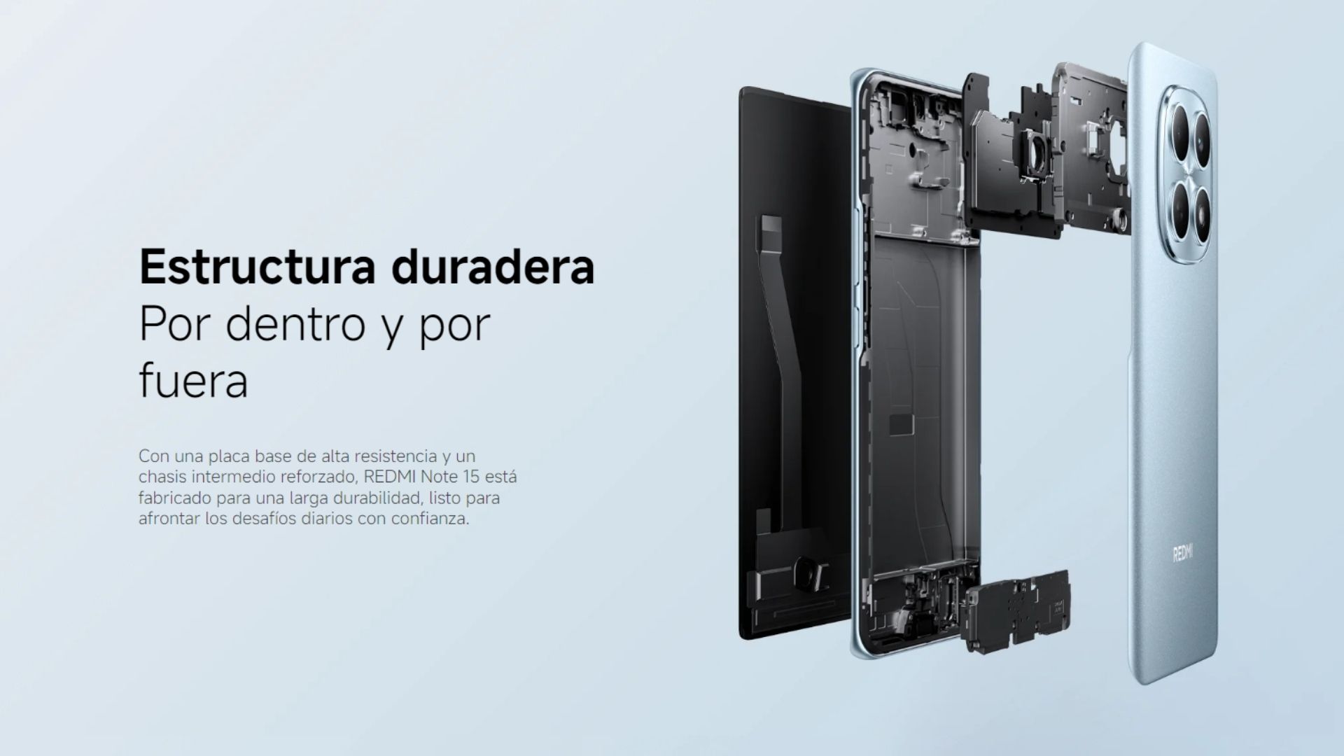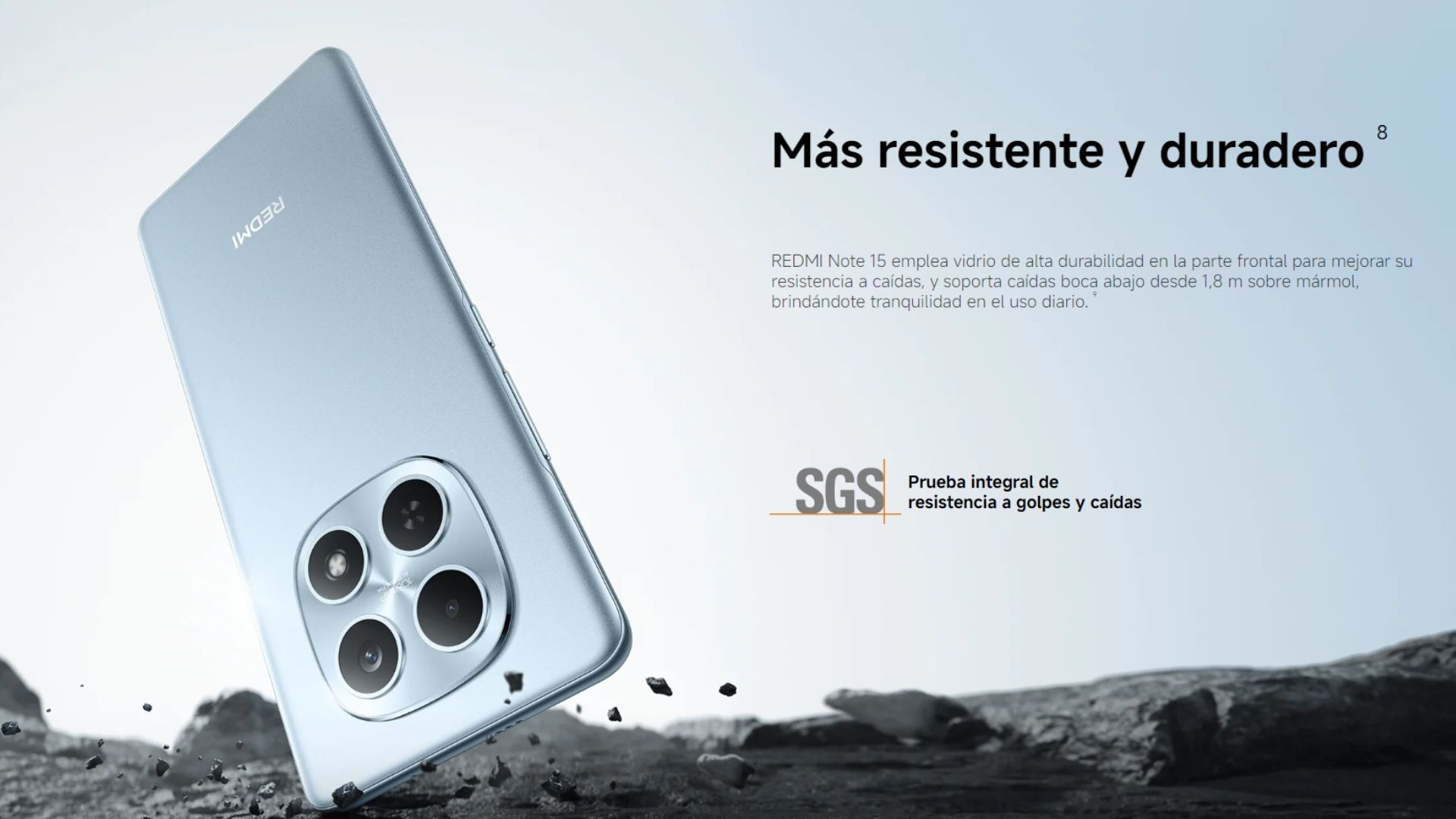 REDMI Note 15 emplea vidrio de alta durabilidad en la parte frontal para mejorar su resistencia a caídas, y soporta caídas boca abajo desde 1,8 m sobre mármol, brindándote tranquilidad en el uso diario.