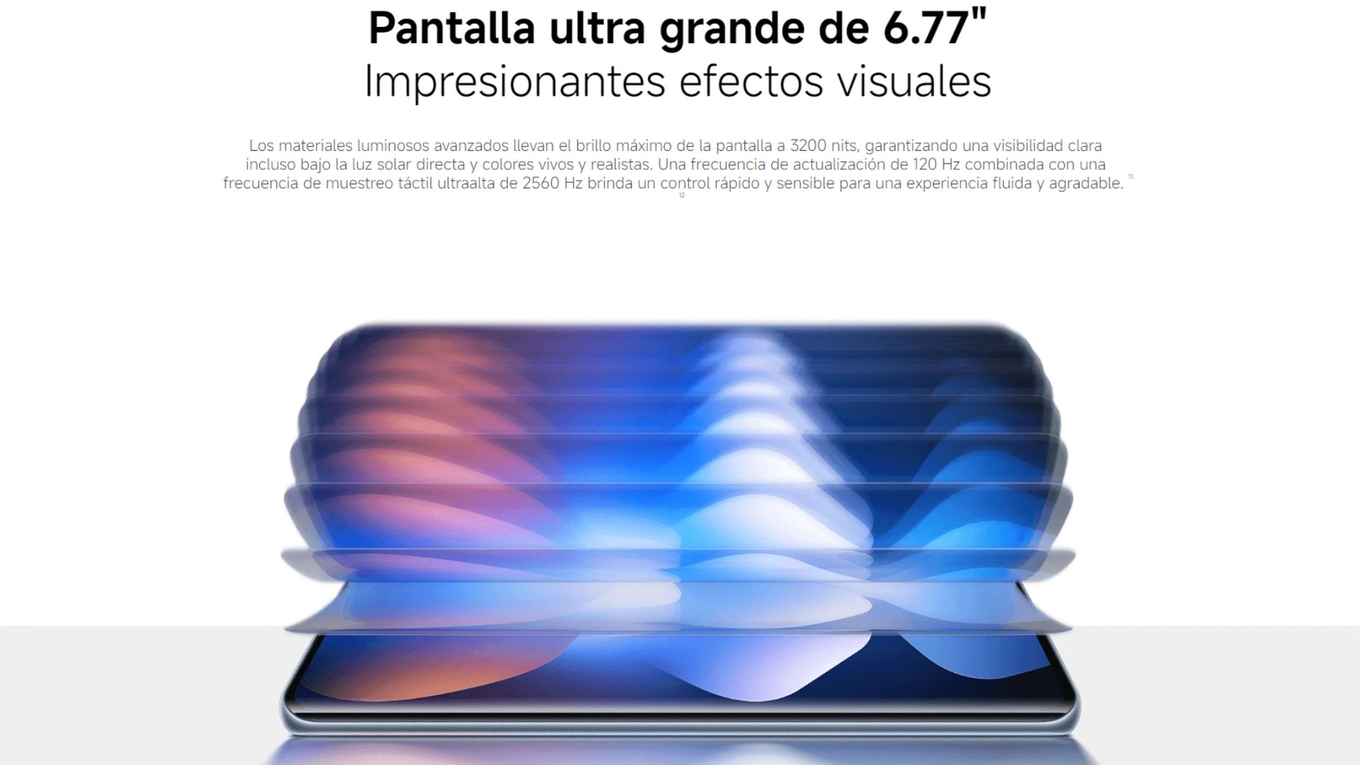 Pantalla AMOLED de 6.77" | Resolución: 2392 × 1080 | Frecuencia de actualización: hasta 120 Hz | Frecuencia de muestreo táctil: 240 Hz | Brillo: 3200 nits de brillo máximo, 800 nits (typ) | Profundidad de color: 12 bit | Relación de contraste: 8000000:1 | Gama de colores DCI-P3 | Pantalla a plena luz solar | Modo de lectura | 3840Hz PWM dimming|16000 niveles de ajuste de brillo | Relación pantalla-cuerpo: 93% | Certificación TÜV Rheinland Low Blue Light (Hardware Solution) | Certificación TÜV Rheinland Circadian Friendly | Certificación TÜV Rheinland Flicker Free