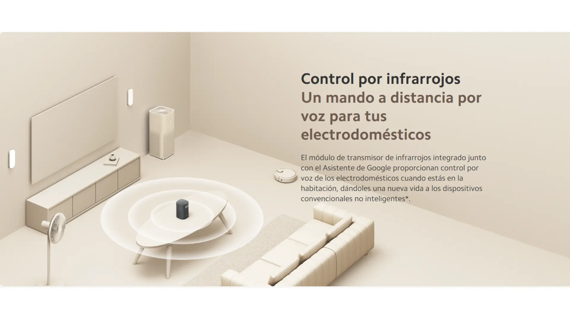 Mando a distancia por infrarrojos La función de control por infrarrojos del Xiaomi Smart Speaker (IR Control) solo la admiten dispositivos compatibles. Probado con los modelos: ventiladores: CHANGHONG CFS-LD402RF, Midea FS40-13GR; proyectores: Epson EMP-1710, HITACHI HCP-810X; aires acondicionados: MIJIA KFR-50GW/N1A1; pantallas de TV: Mi LED TV 4S 65’’, Mi TV P1 50’’; LED: Panasonic HHXZ4034.
