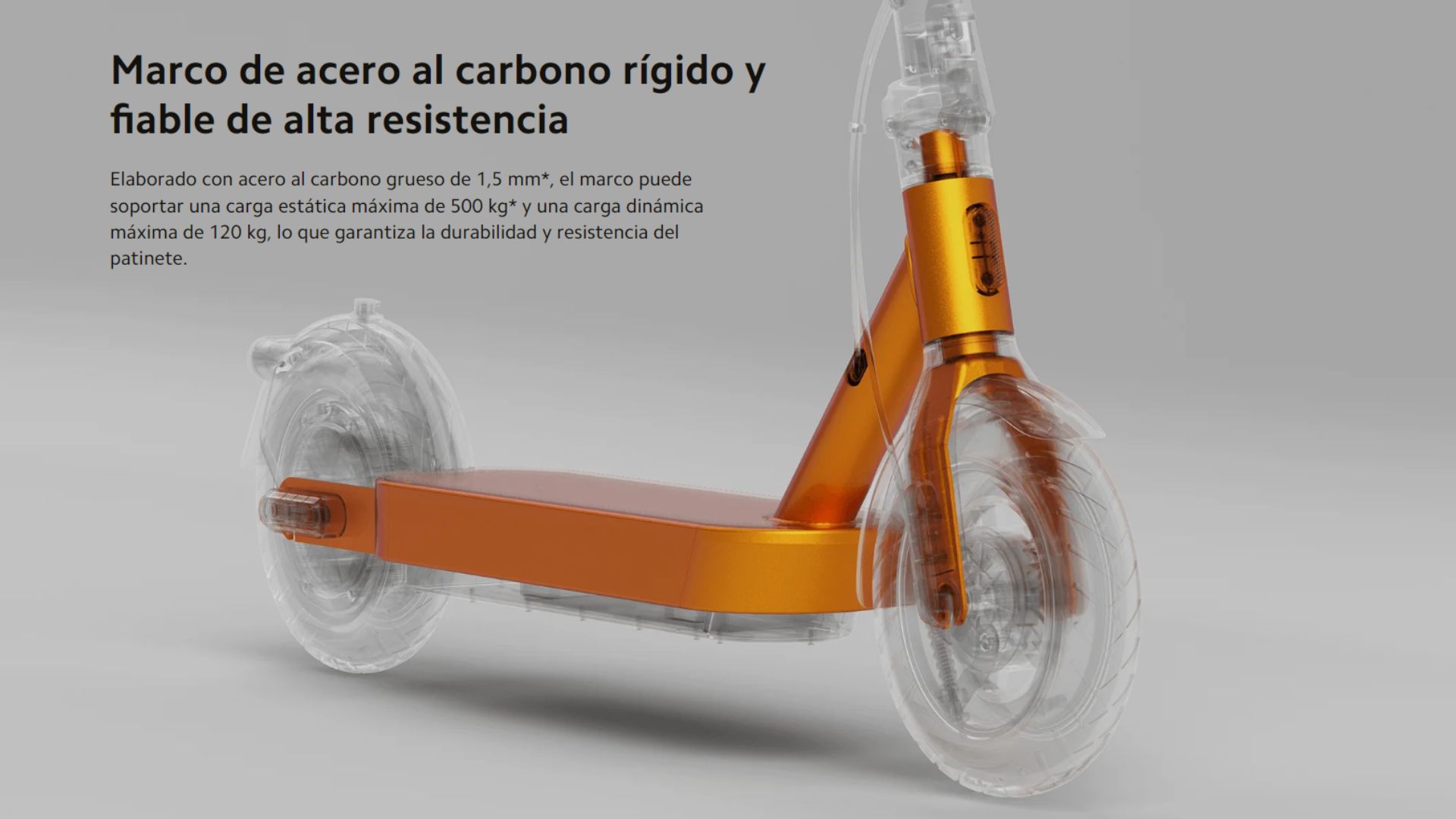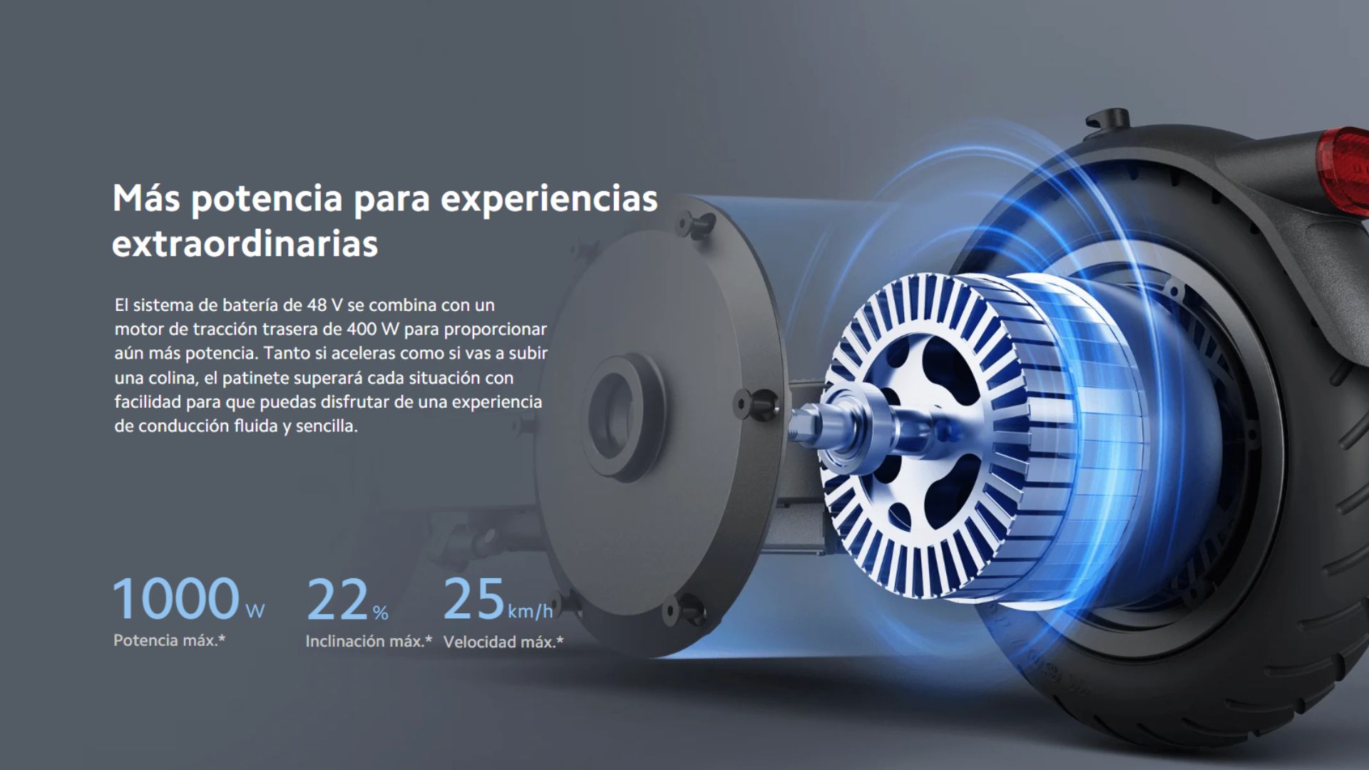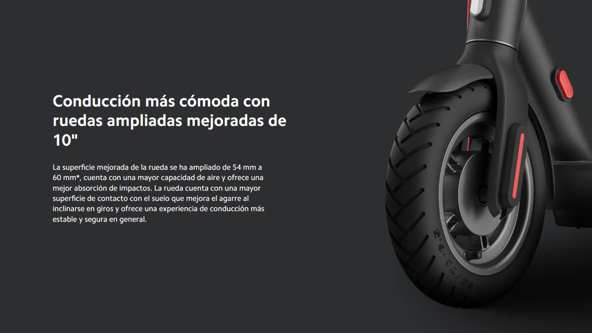 1000 W Potencia máxima | 60 km Autonomía del patinete | 25 km/h Velocidad máx. | 10" Ruedas sin cámara ampliadas | 22 % Pendiente máxima | Indicador de dirección integrado | Marco de acero al carbono de alta resistencia | Modo de luz automática