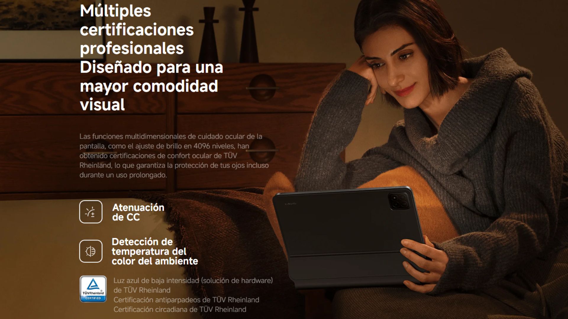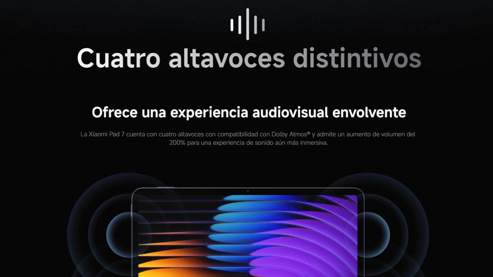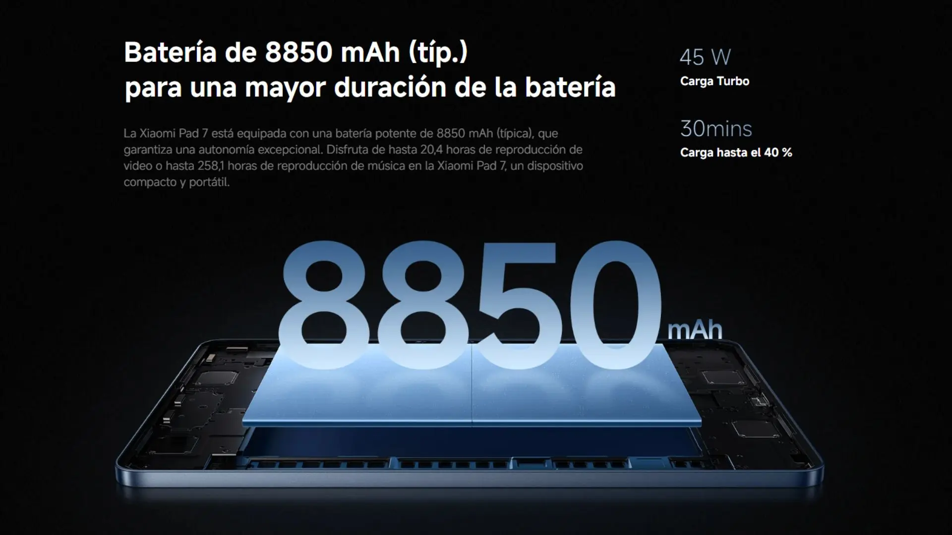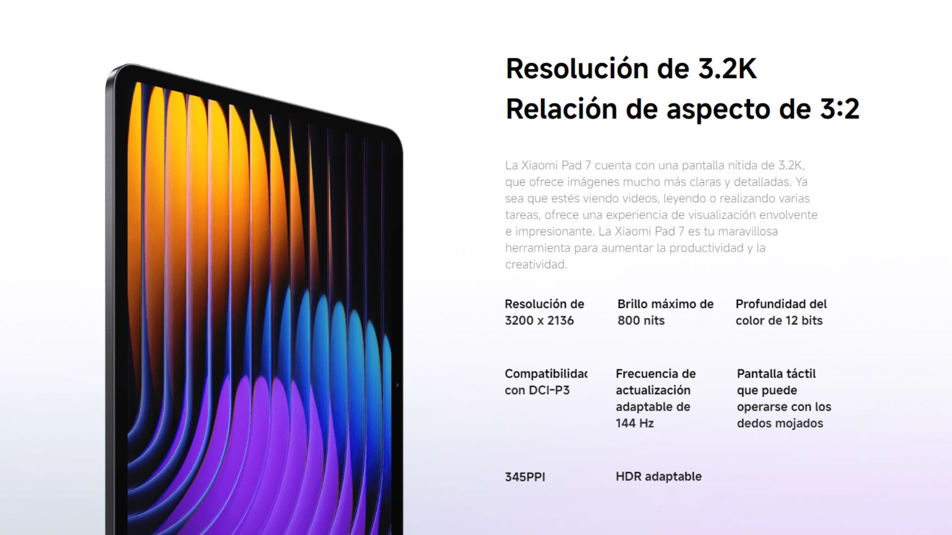 Pantalla Pantalla nítida 3.2K de 144 Hz | 11.2” | 3:2 | 3200 x 2136, 345 ppp | Hasta 144 Hz | Hasta 360 Hz - 240 Hz (con pluma) | Brillo máximo de 800 nits | Certificación de luz azul de baja intensidad (solución de hardware) de TÜV Rheinland | Certificación antiparpadeos de TÜV Rheinland | Certificación de configuración amigable para el ritmo circadiano de TÜV Rheinland | Original Color PRO | Modo de luz solar | 68 mil millones de colores | DCI-P3 | Pro HDR | Modo lectura | Colores adaptativos | Motor de imagen con IA | HDR10 | Dolby Vision® | Tecnología táctil para condiciones húmedas | Súper resolución 10x | *El tamaño de la pantalla de la Xiaomi Pad 7 es de aproximadamente de 11,2" en el rectángulo completo cuando se mide en diagonal. El área visible real es menor debido al diseño de esquina curva. Las mediciones entre productos individuales pueden variar. * La pantalla admite una frecuencia de actualización máxima de 144 Hz. La frecuencia de actualización de la pantalla puede variar ligeramente en diferentes interfaces de aplicaciones y calidades de imagen de juegos. Consulta la experiencia real.